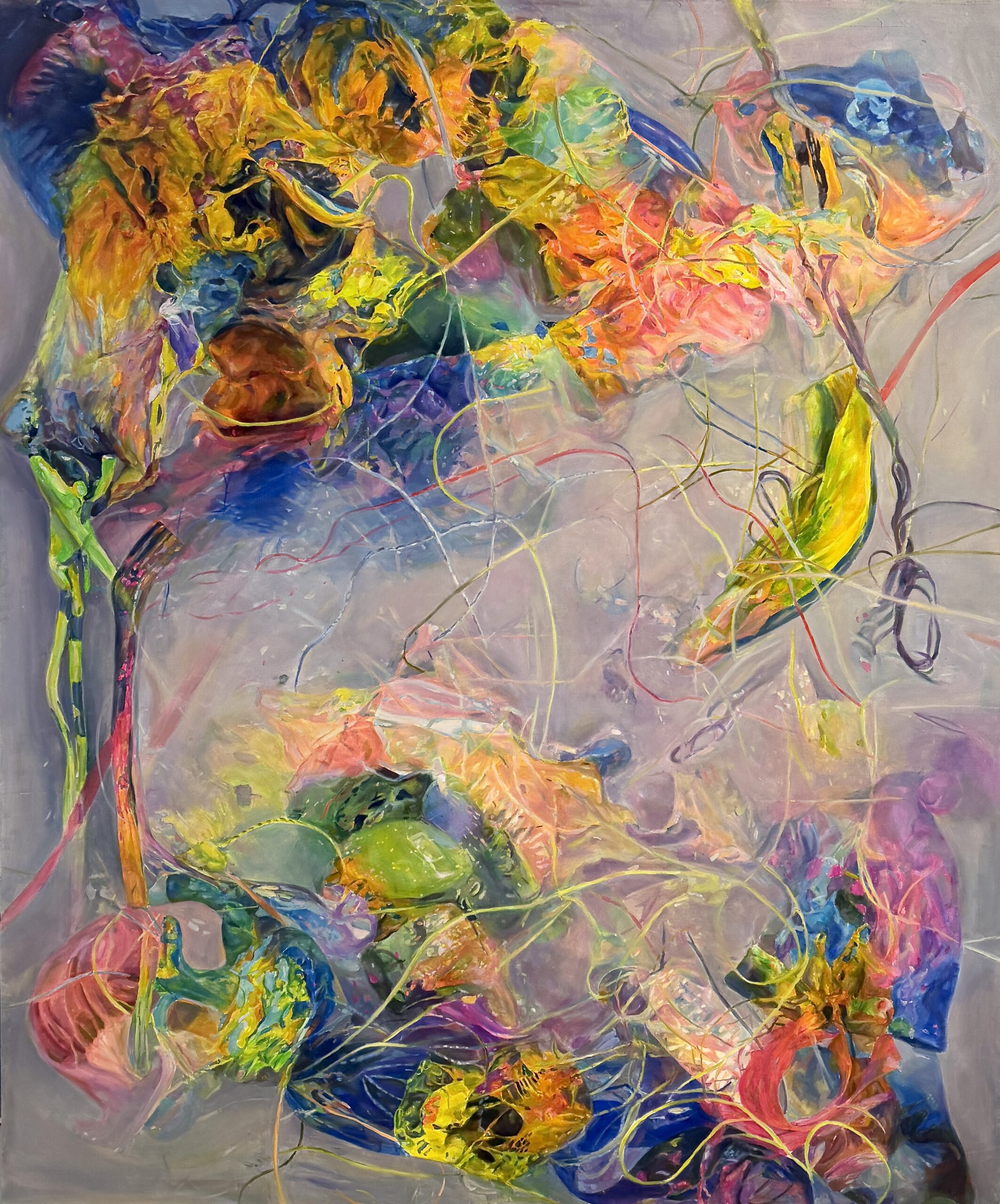 Abstrakcyjna kompozycja rozwijająca się poprzez przenikanie form i ich organiczny rytm, przywołująca skojarzenia z procesami naturalnymi.
