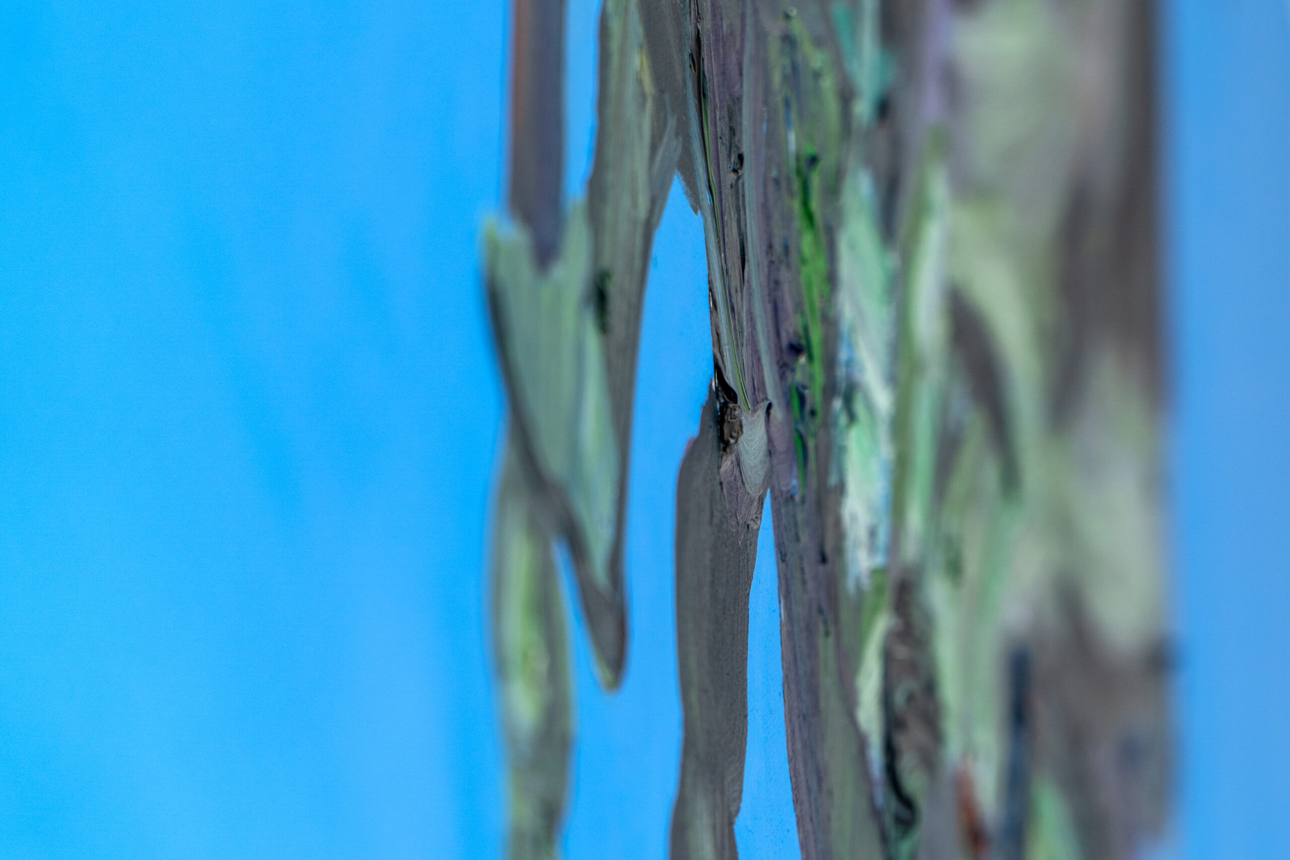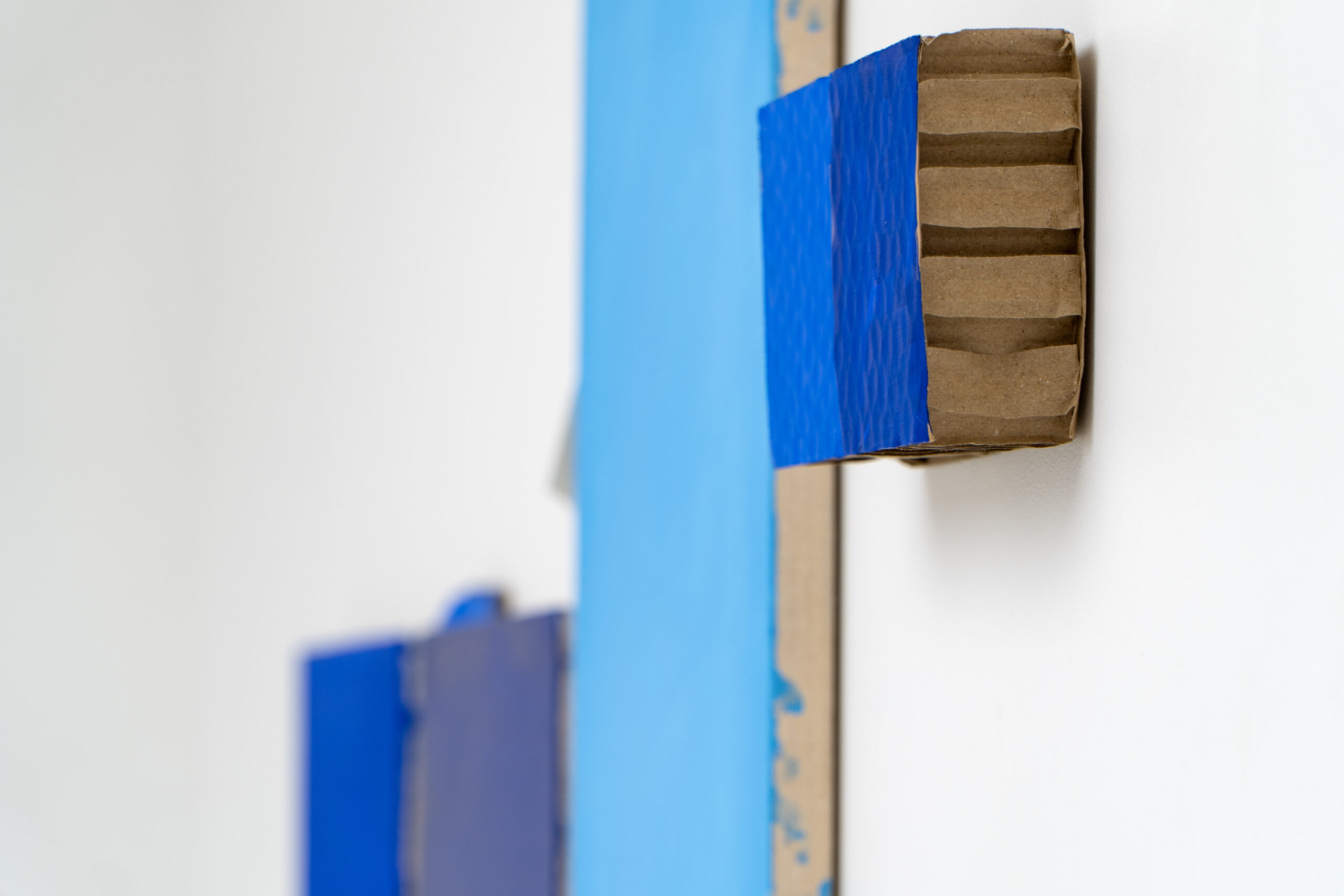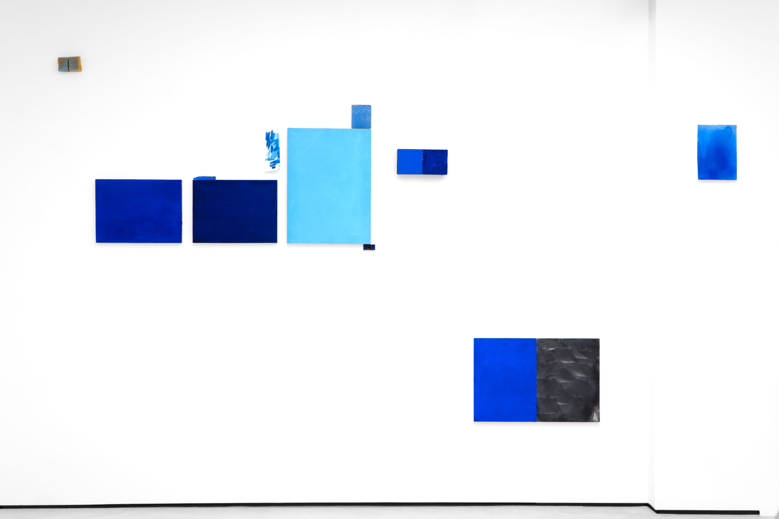 Z kolei malarska wrażliwość Natalii Czarcińskiej, przejawiająca się w cyklu „Niebieskich obrazów”, również łączy kluczowe pytania o definiowanie obrazu z kwestiami czasu, pamięci medium, nawiązaniami do tradycji monochromu czy budowaniem wieloelementowych konstelacji o niejasno określonych, jakby płynnych granicach. To kompozycja, w ramach której sąsiadują ze sobą rozmaite techniki: malarstwo na różnych podłożach, a także fotografia lub wycięte puste ramki, które sami – podobnie jak w wypadku strategii Sebastiana Trzoski – uzupełniamy swoją wyobraźnią. Napotykamy różne tony i odcienie niebieskiego, różne nasycenia tej barwy, co z kolei wiedzie nasze skojarzenia zarówno ku naturze, a więc przedstawieniom nieba i wody, postrzeganych w rozmaitej aurze, jak i ku historii sztuki i słynnym monochromom Yvesa Kleina. Gesty Natalii Czarcińskiej są więc poszerzeniem działania obrazu na przestrzeń, co świetnie koreluje ze słowami Ellswortha Kelly’ego: „Moją intencją było podzielenie przestrzeni, a nie aranżowanie form.” „Niebieskie obrazy” unoszą się lekko w swoim otoczeniu, nie potrzebując ram – oddychają poetycką wolnością.