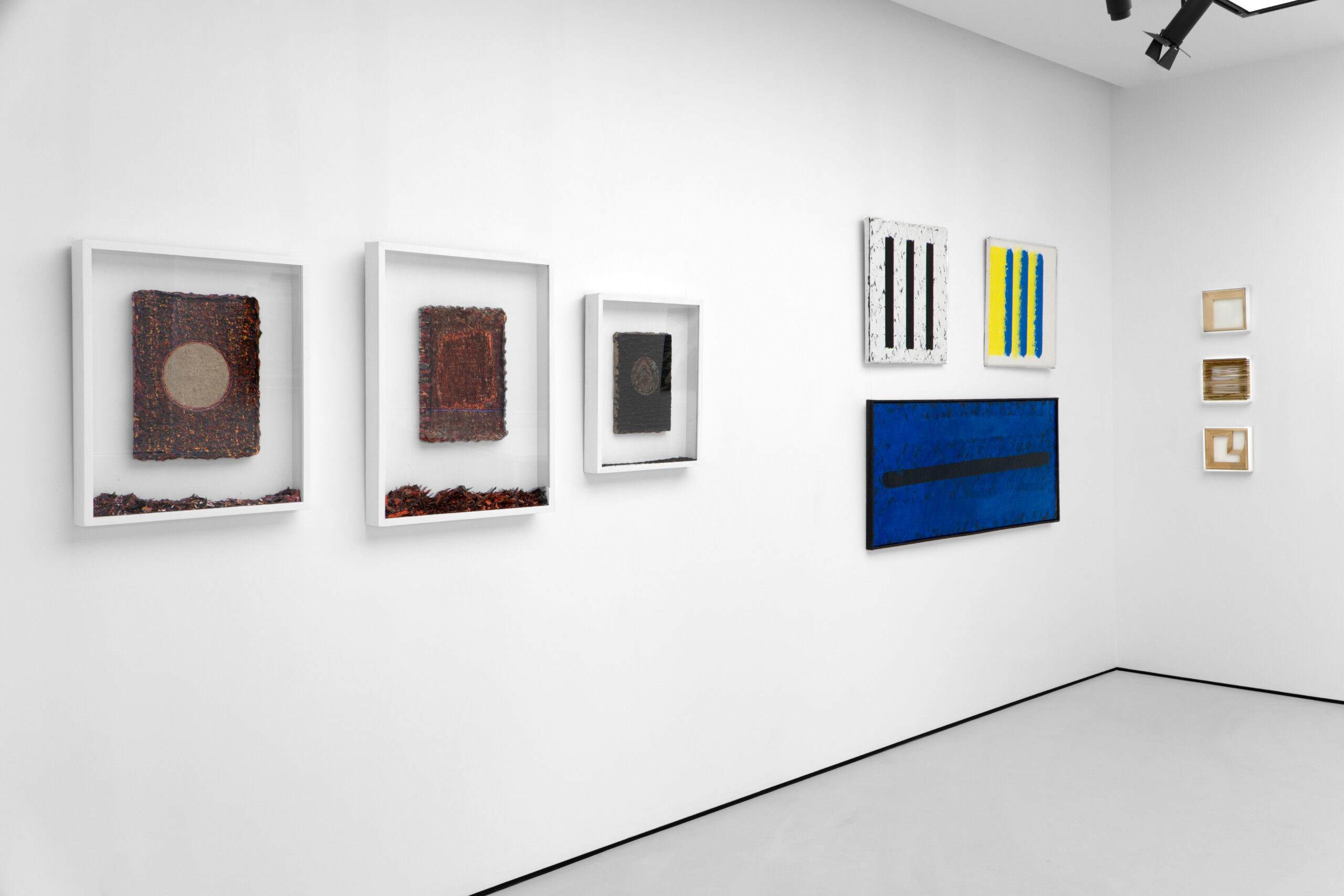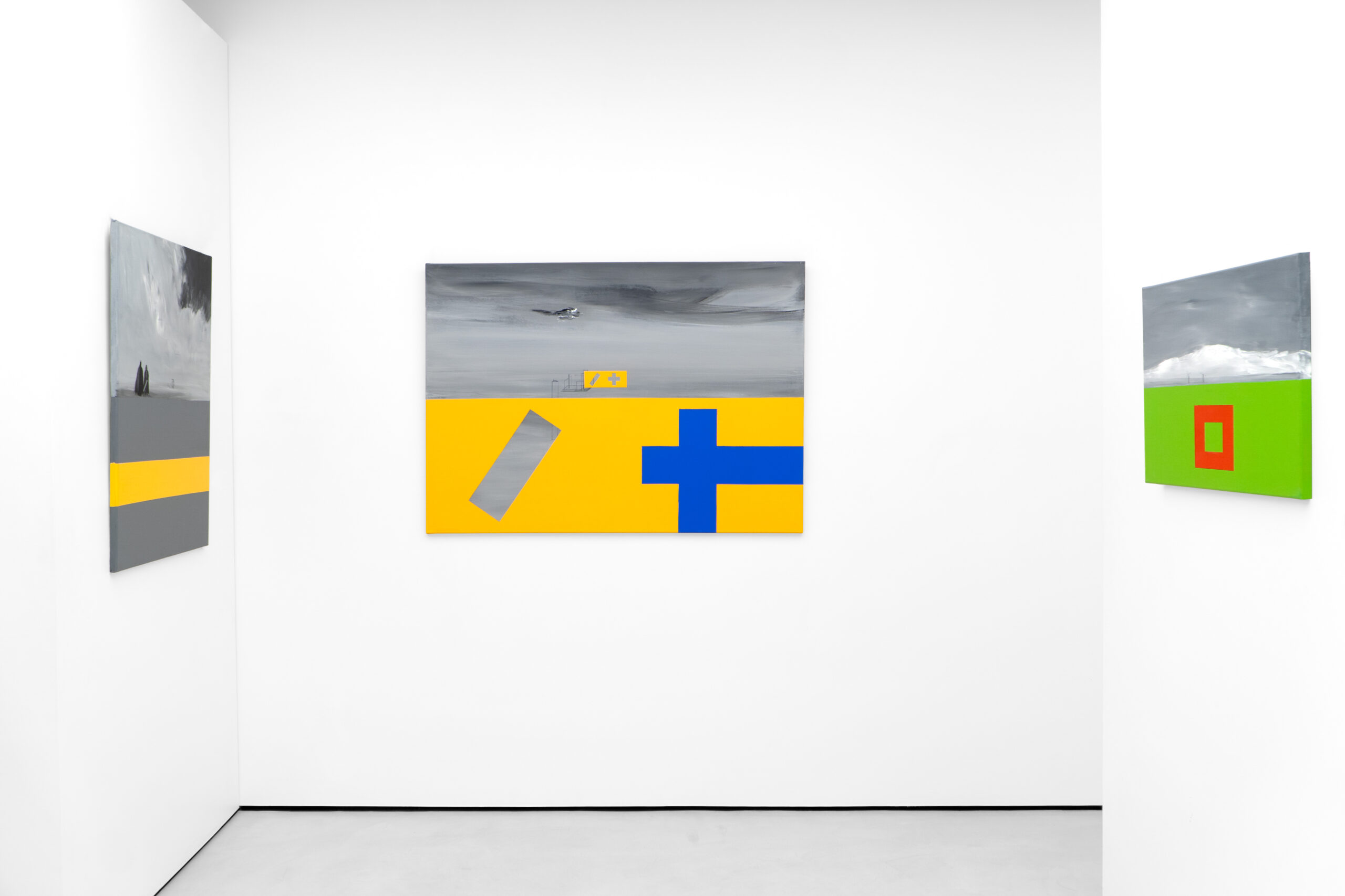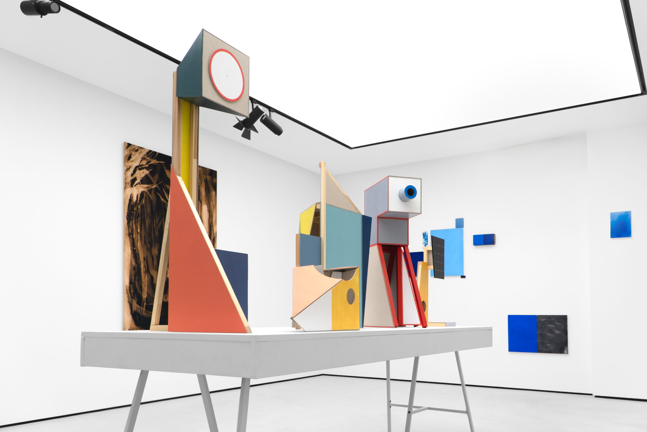 Z kolei malarska wrażliwość Natalii Czarcińskiej, przejawiająca się w cyklu „Niebieskich obrazów”, również łączy kluczowe pytania o definiowanie obrazu z kwestiami czasu, pamięci medium, nawiązaniami do tradycji monochromu czy budowaniem wieloelementowych konstelacji o niejasno określonych, jakby płynnych granicach. To kompozycja, w ramach której sąsiadują ze sobą rozmaite techniki: malarstwo na różnych podłożach, a także fotografia lub wycięte puste ramki, które sami – podobnie jak w wypadku strategii Sebastiana Trzoski – uzupełniamy swoją wyobraźnią. Napotykamy różne tony i odcienie niebieskiego, różne nasycenia tej barwy, co z kolei wiedzie nasze skojarzenia zarówno ku naturze, a więc przedstawieniom nieba i wody, postrzeganych w rozmaitej aurze, jak i ku historii sztuki i słynnym monochromom Yvesa Kleina. Gesty Natalii Czarcińskiej są więc poszerzeniem działania obrazu na przestrzeń, co świetnie koreluje ze słowami Ellswortha Kelly’ego: „Moją intencją było podzielenie przestrzeni, a nie aranżowanie form.” „Niebieskie obrazy” unoszą się lekko w swoim otoczeniu, nie potrzebując ram – oddychają poetycką wolnością.
