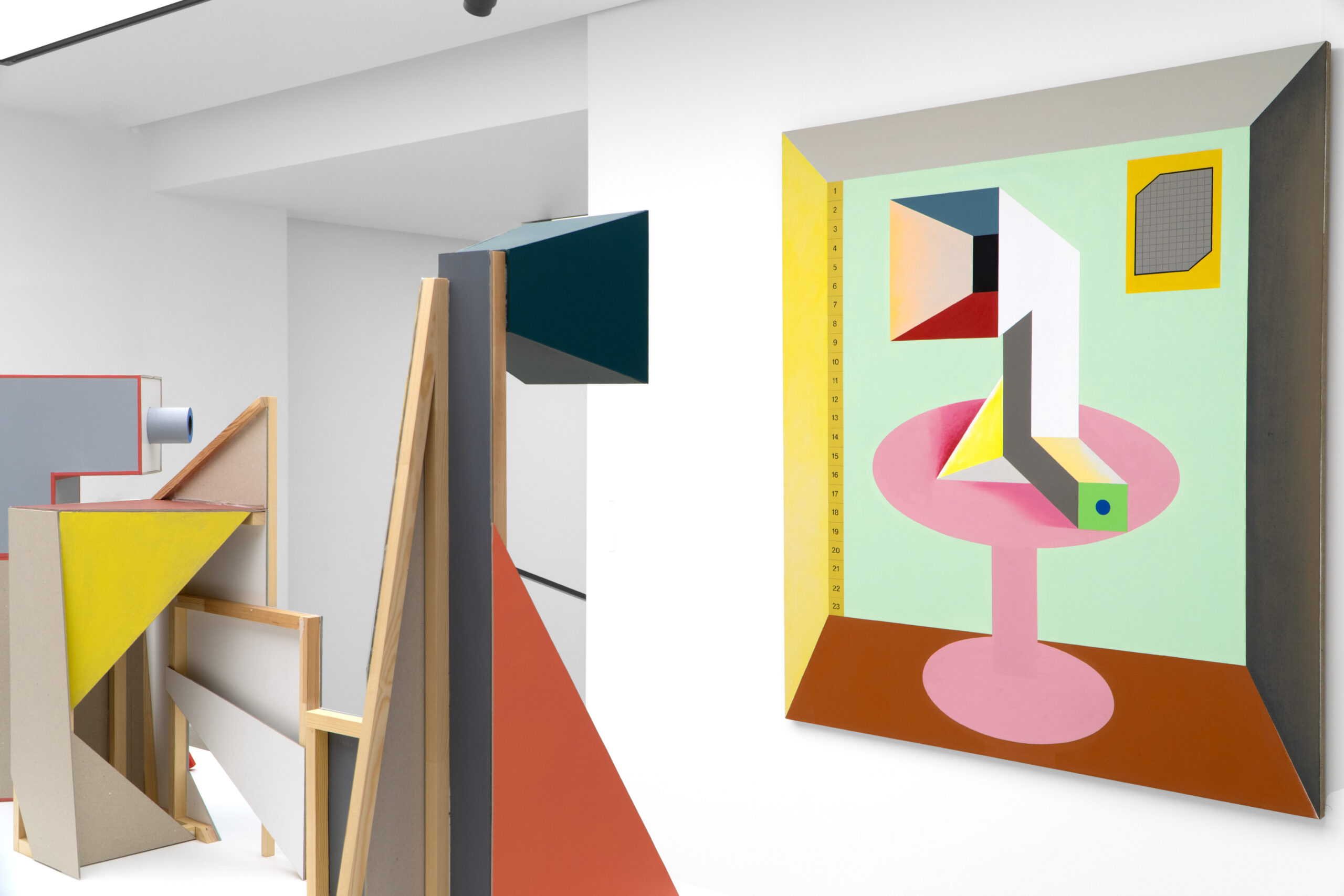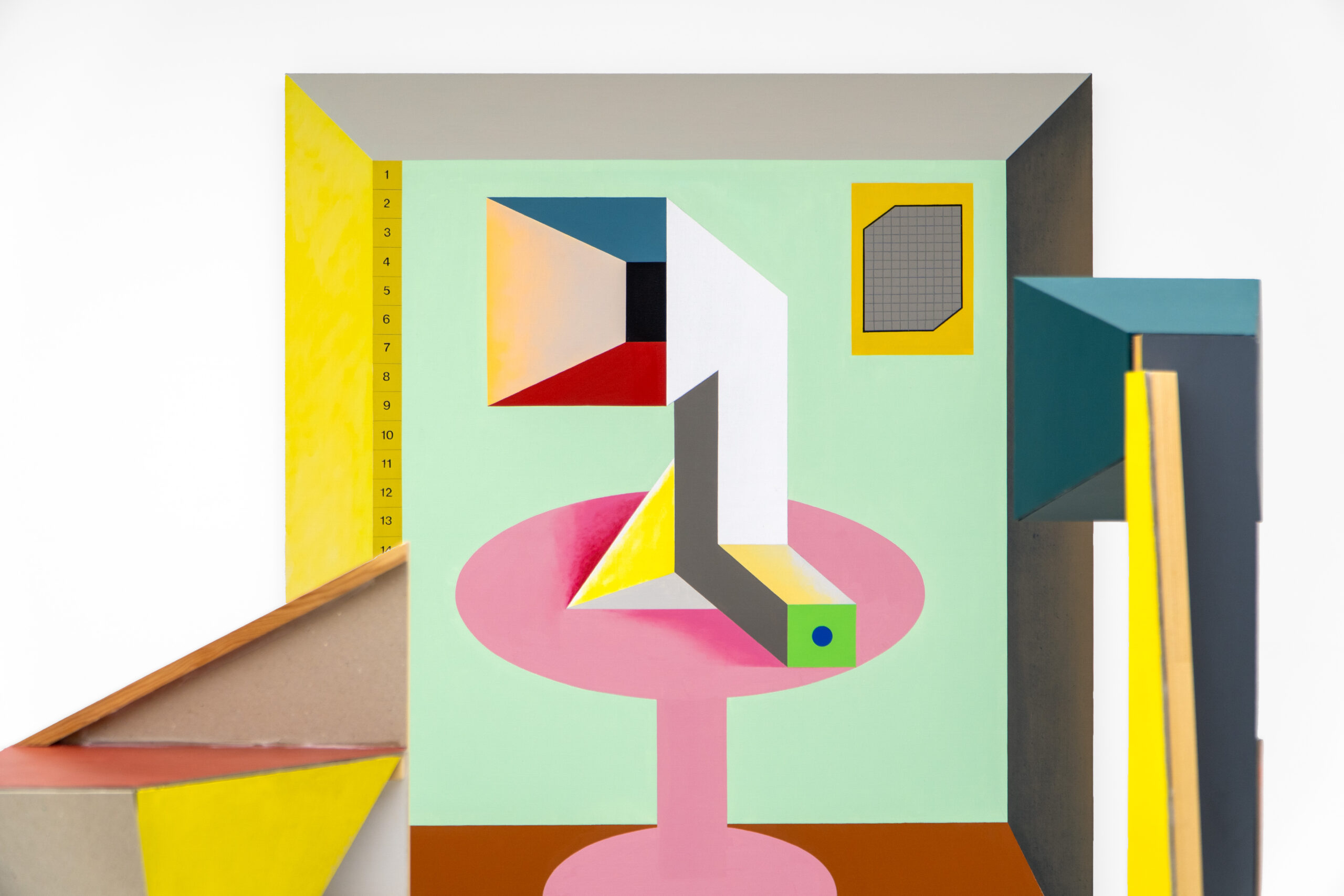 Na granicy przedstawienia i abstrakcji balansuje również – choć w zupełnie odmienny sposób – Wojciech Gorączniak. Z kanciastych form geometrycznych artysta buduje elementy, które stają się rozpoznawalne w kategoriach przedmiotowych. W „Pokoju dyktatora” to stolik, ustawione na nim coś w rodzaju tuby gramofonu czy obrazek na ścianie, w którego ramy oprawiono kartkę papieru w kratkę. Wnętrze jest dziwnie płytkie, klaustrofobiczne, opresyjne. Możemy wyobrażać sobie pełne zdecydowania przemówienie dyktatora, sączące się z tuby-szczekaczki. Kompozycja znajduje swoje „przedłużenie” w „Makiecie I”, która jako trójwymiarowy obiekt grupuje zestaw osobliwych urządzeń, pasujących do tuby z „Pokoju dyktatora” – jest wśród nich m. in. kamera, co zdaje się potęgować uczucie bycia obserwowanymi i podporządkowanymi czyimś dyktatorskim zapędom.