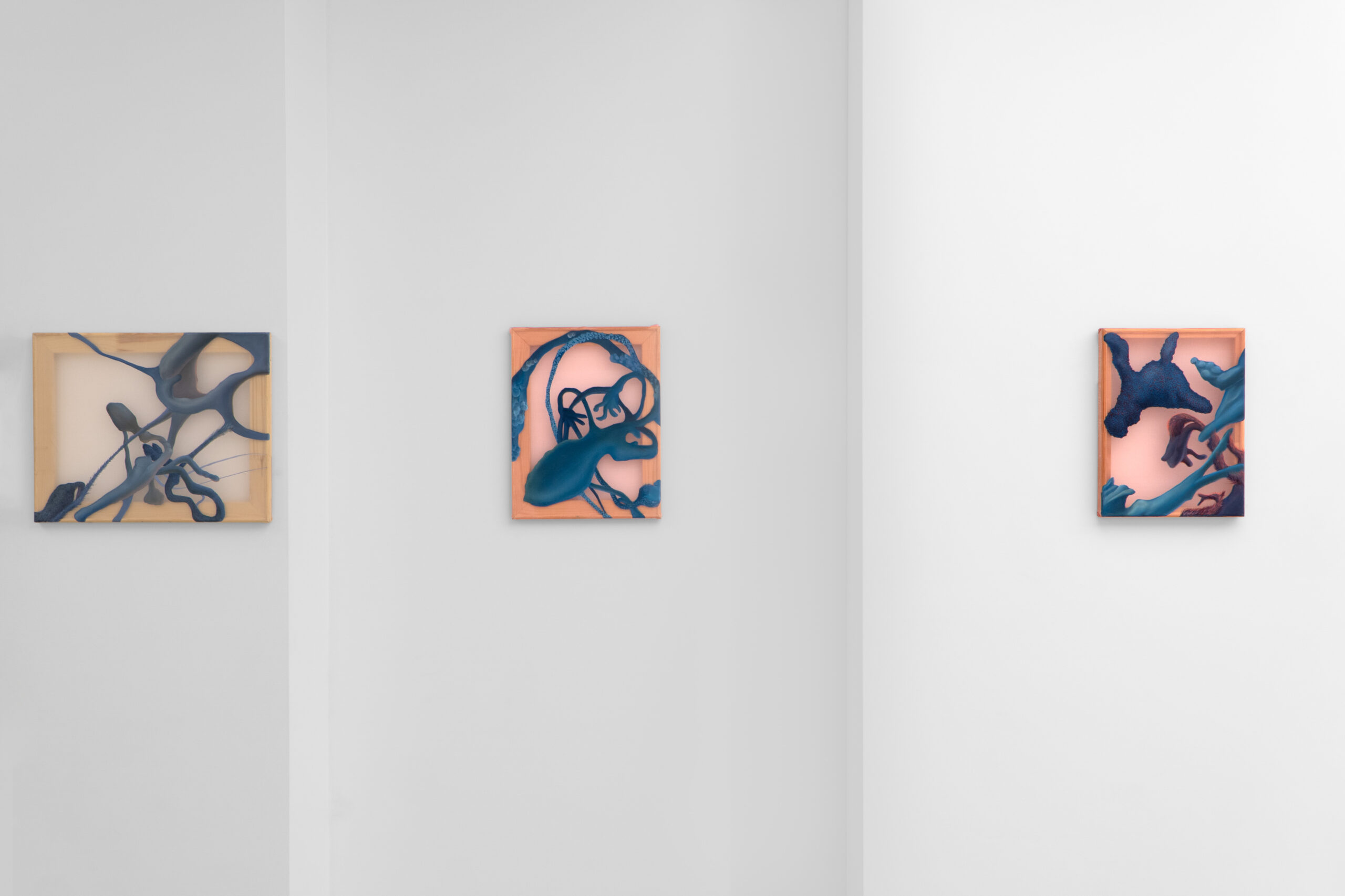 Obrazy Julii Królikowskiej powstają z kolei na transparentnej, delikatnej organzie, która nadaje kompozycjom lekkości i intensyfikuje postrzeganie namalowanych motywów. Jawią się one na owym przezroczystym podłożu niczym formy nieledwie namacalne, haptyczne i twójwymiarowe. Malowane mieszanką akrylów i olejów lśnią na powierzchni niczym wilgotne tkanki. Artystka czyni widzialnymi takie części ciała jak powięź – trójwymiarowa sieć tkanki łącznej, pajęczynówka – jedna z trzech opon mózgowo-rdzeniowych czy kosmówka – czyli błonależąca między owodnią i błoną śluzową macicy. Zyskujemy wgląd w te miejsca ciała, które uchylają się naszym oczom i spojrzeniom, pozostając głęboko ukryte. Julia Królikowska przedstawia zatem to, o czym tak obrazowo pisze Olga Tokarczuk: „To kolor wnętrza, ciemności, miejsc, gdzie nie dociera słońce, gdzie materia kryje się w wilgoci przed cudzym wzrokiem, a więc nie musi się już popisywać.” Czy to jednak na pewno te elementy naszej cielesności? Przecież jawią się tak abstrakcyjnie…